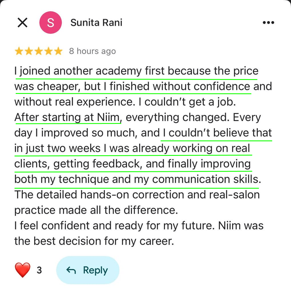 After switching to NIIM, hands-on practice and clear correction helped her improve quickly and within a short time, she was already serving paying clients with confidence.